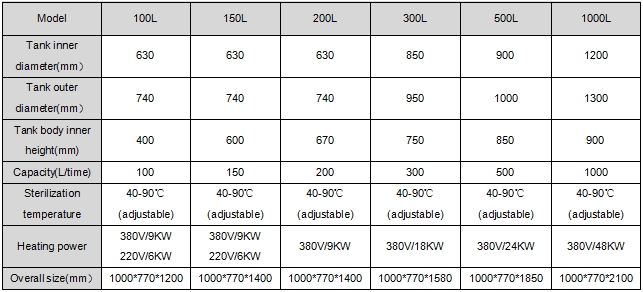 The single-tankpasteurizer adopts three-layer stainless steel structure with stirring and automatic temperature control system, sterilization temperature is adjustable from 40 to 90°C, and the water cooling reduces temperature to around 40°C.